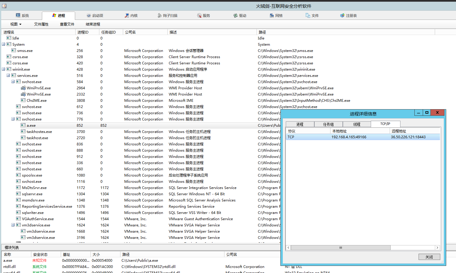 查看可疑进程 a.exe