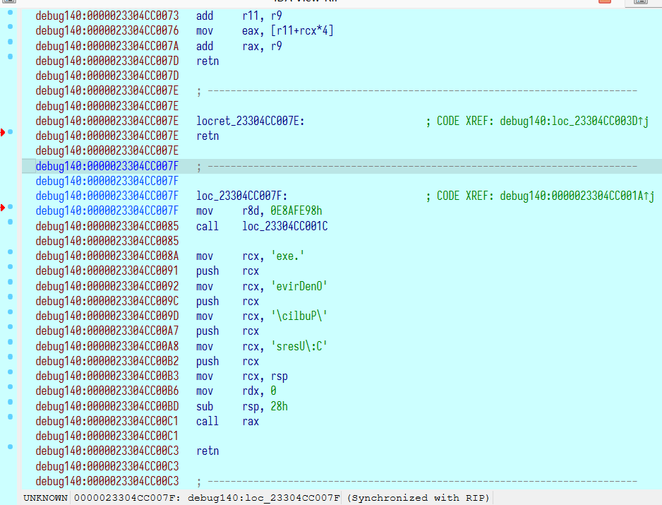 通过快捷键 c 转换为汇编代码,可以看到实际上是执行了刚才释放的 OneDrive.exe