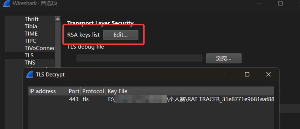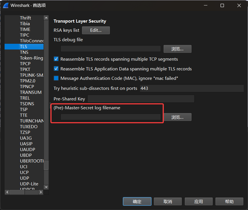 在 Wireshark 中配置密钥,编辑 - 首选项 - Protocol-TLS