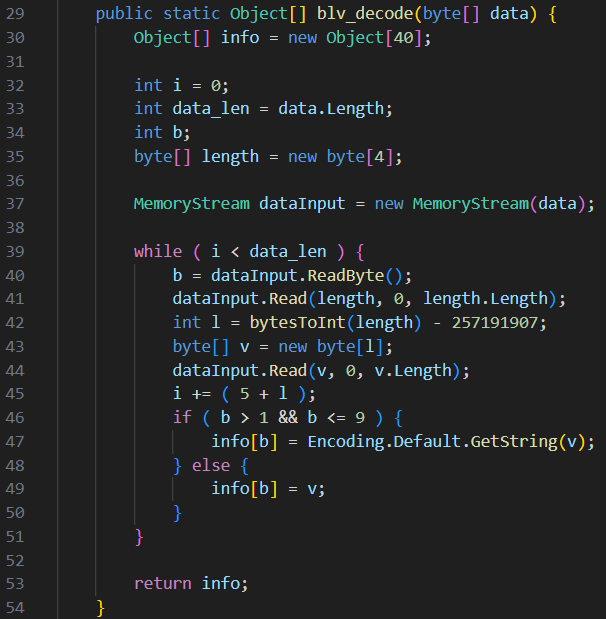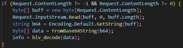 解密逻辑比较明显,首先进行 FromBase64String() ,然后 blv_decode()