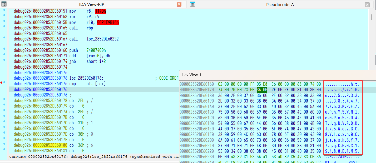 继续往下找可以看到有字节数据,存放了 C2 通信地址