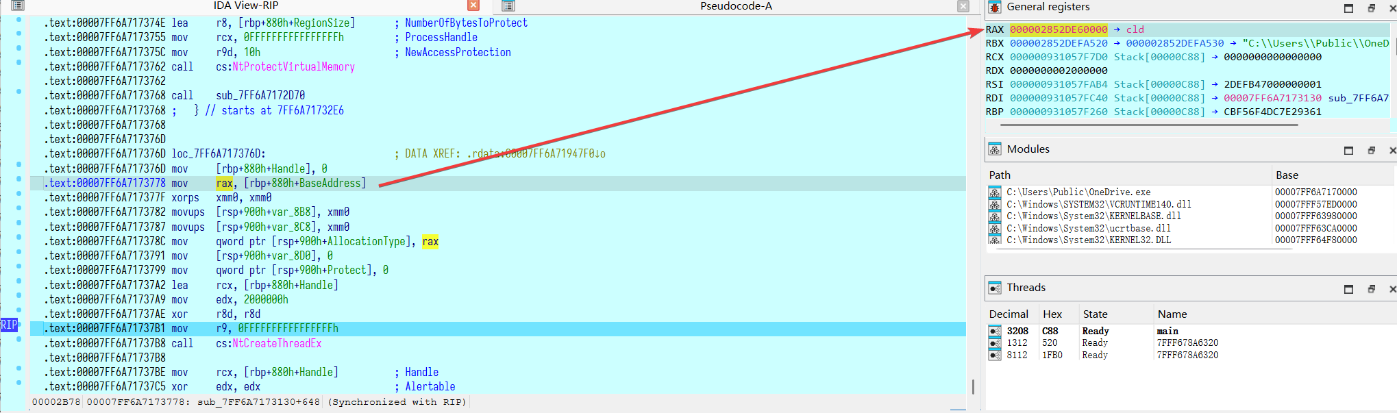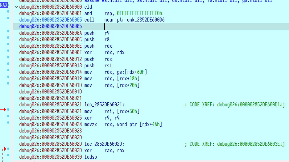 在 CreateThread 创建线程之前翻找一下内存,可以看到 RAX 已经指向了解密出来的 shellcode 的地址