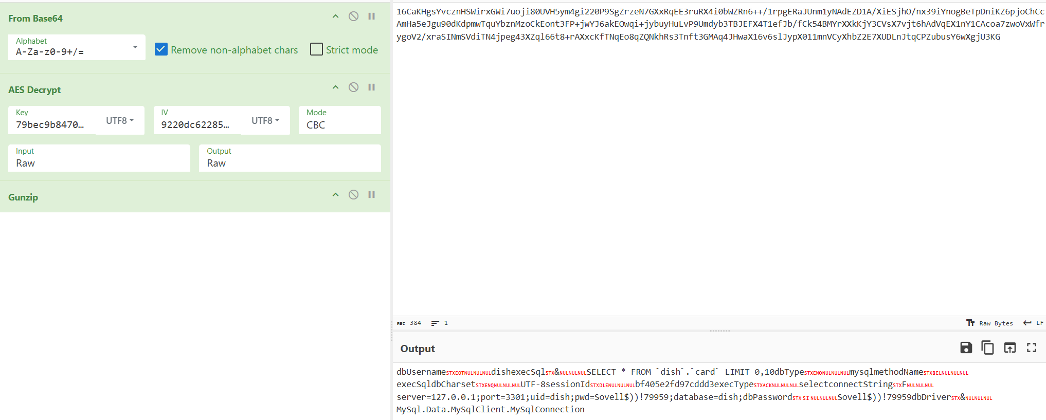 connectString server=127.0.0.1;port=3301;uid=dish;pwd=Sovell$))!79959;database=dish; | |
