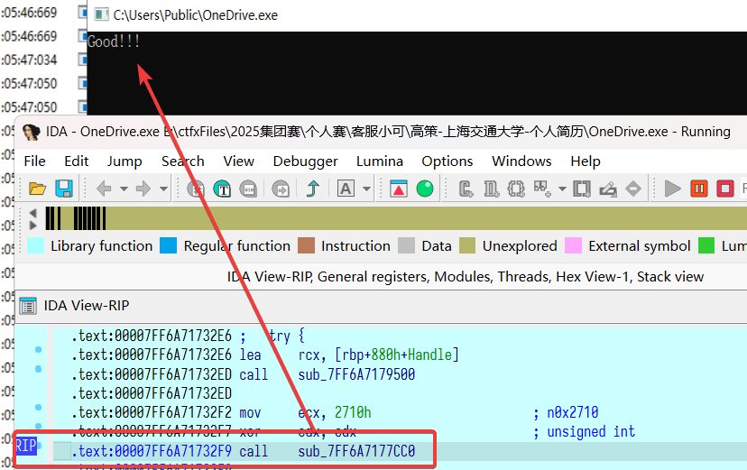 ida 打开 OneDrive.exe 分析,搜索字符串 Good!!! 找到对应函数