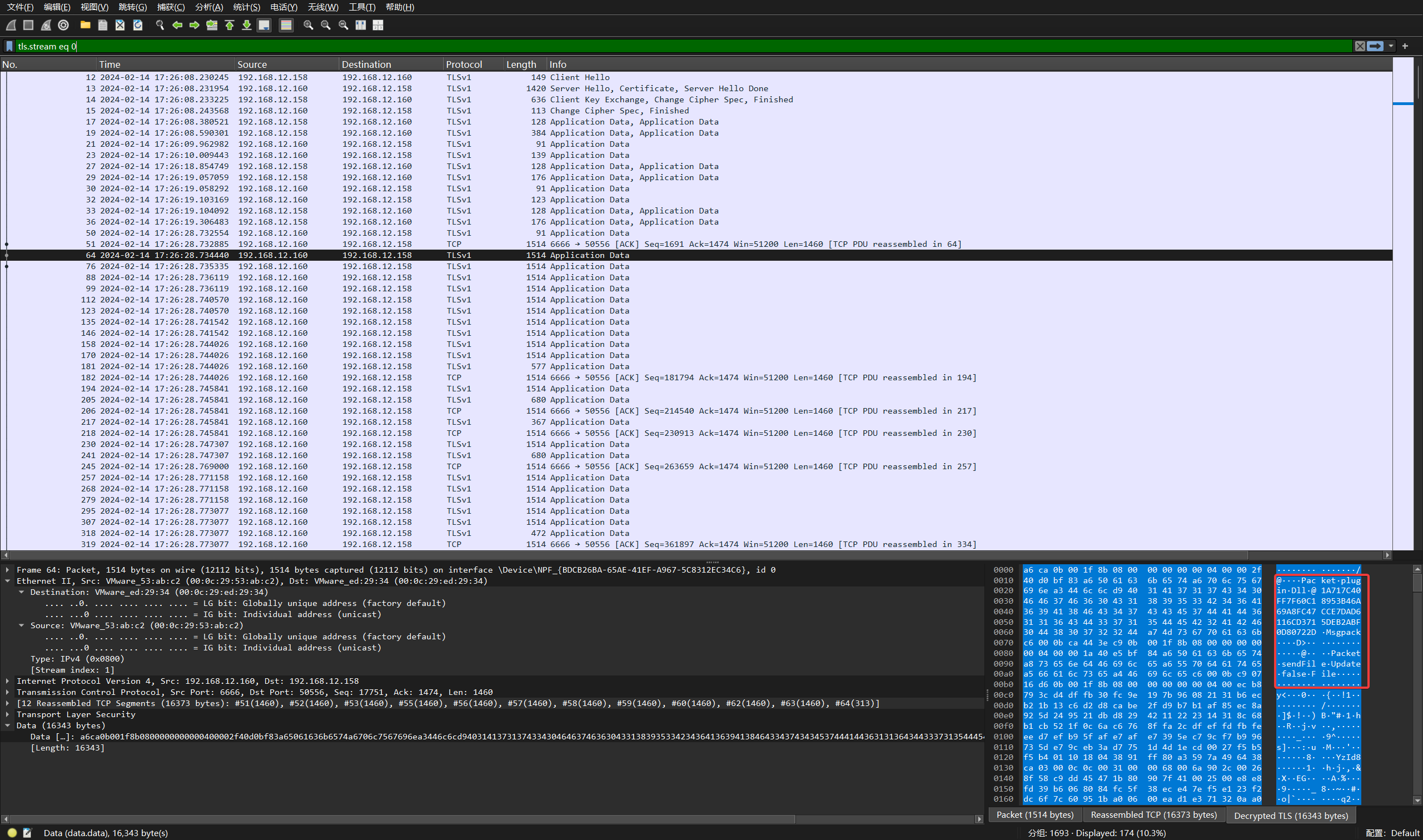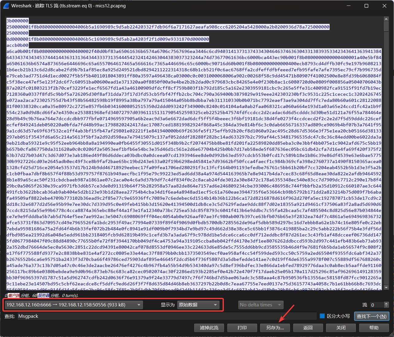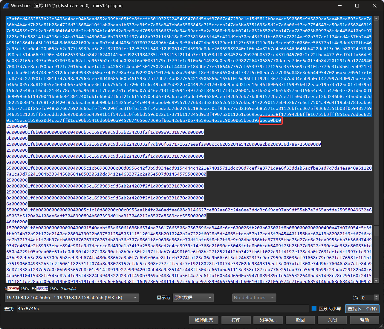 点击确定后就能解密 TLS 流量,翻找到存在一些明文数据的数据包,追踪 TCP 流