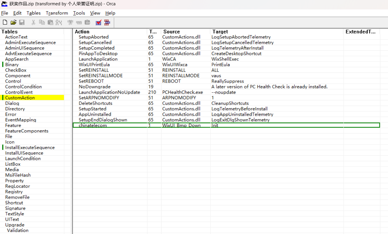 用 orca 打开分析, CustomAction 表中新增一项,调用了 WixUI_Bmp_Down 的 Init 函数