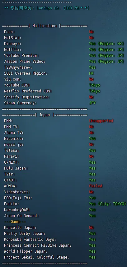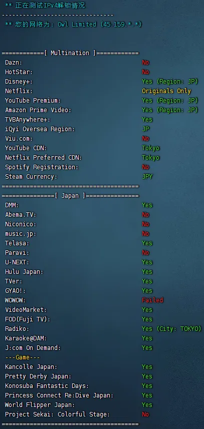 1 45.159.49.1 AS23959 JP Tokyo Tokyo owl.net 5.25 ms / 5.26 ms / 4.87 ms 2 * 3 211.14.4.177 AS9607 日本 东京都 东京 bbtower.co.jp AS23959.xe-0-1-6.tedge0503.newote.bbtower.ad.jp. 8.62 ms / 8.39 ms / 8.65 ms 4 211.14.4.178 AS9607 日本 东京都 bbtower.co.jp xe-0-1-6.tedge0503.newote.bbtower.ad.jp. 0.92 ms / 0.63 ms / 0.94 ms 5 124.147.3.69 AS9607 日本 东京都 东京 bbtower.co.jp et-100-0-18.core0501.newote.bbtower.ad.jp. 0.54 ms / 0.60 ms / 0.72 ms 6 124.147.2.1 AS9607 日本 东京都 bbtower.co.jp vlan103.xborder0501.newote.bbtower.ad.jp. 0.75 ms / 0.55 ms / 0.76 ms 7 210.138.130.225 AS2497 日本 东京都 iij.ad.jp 1.12 ms / 0.90 ms / 1.10 ms 8 58.138.98.73 AS2497 日本 东京都 东京 iij.ad.jp tky009bb00.IIJ.Net. 11.26 ms / 11.40 ms / 10.39 ms 9 58.138.112.50 AS2497 日本 东京都 东京 iij.ad.jp tky009ix03.IIJ.Net. 1.34 ms / 1.60 ms / 1.49 ms 10 203.215.237.13 * 日本 东京都 东京 中国电信 2.77 ms / 3.13 ms / 3.10 ms 11 * 12 202.97.33.125 AS4134 中国 上海市 上海市 chinatelecom.cn 53.48 ms / 50.83 ms / 50.12 ms 13 * 14 202.97.28.2 AS4134 中国 重庆市 重庆市 chinatelecom.cn 81.15 ms / 81.54 ms / 81.55 ms 15 139.206.135.42 AS38283 中国 四川省 成都市 net.ru 83.41 ms / * ms / * ms 16 * 17 118.112.16.114 AS38283 中国 四川省 成都市 net.ru 85.44 ms / * ms / 85.66 ms 18 * 19 * 20 * 21 * 22 139.155.*.* AS45090 中国 四川省 成都市 tencent.com 92.05 ms / 91.14 ms / 91.91 ms成都电信